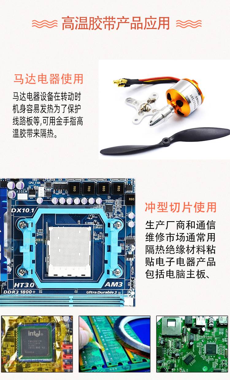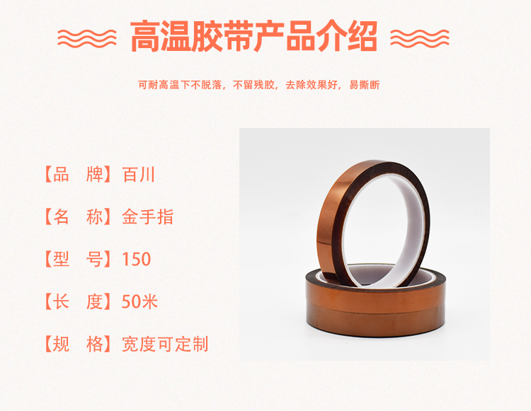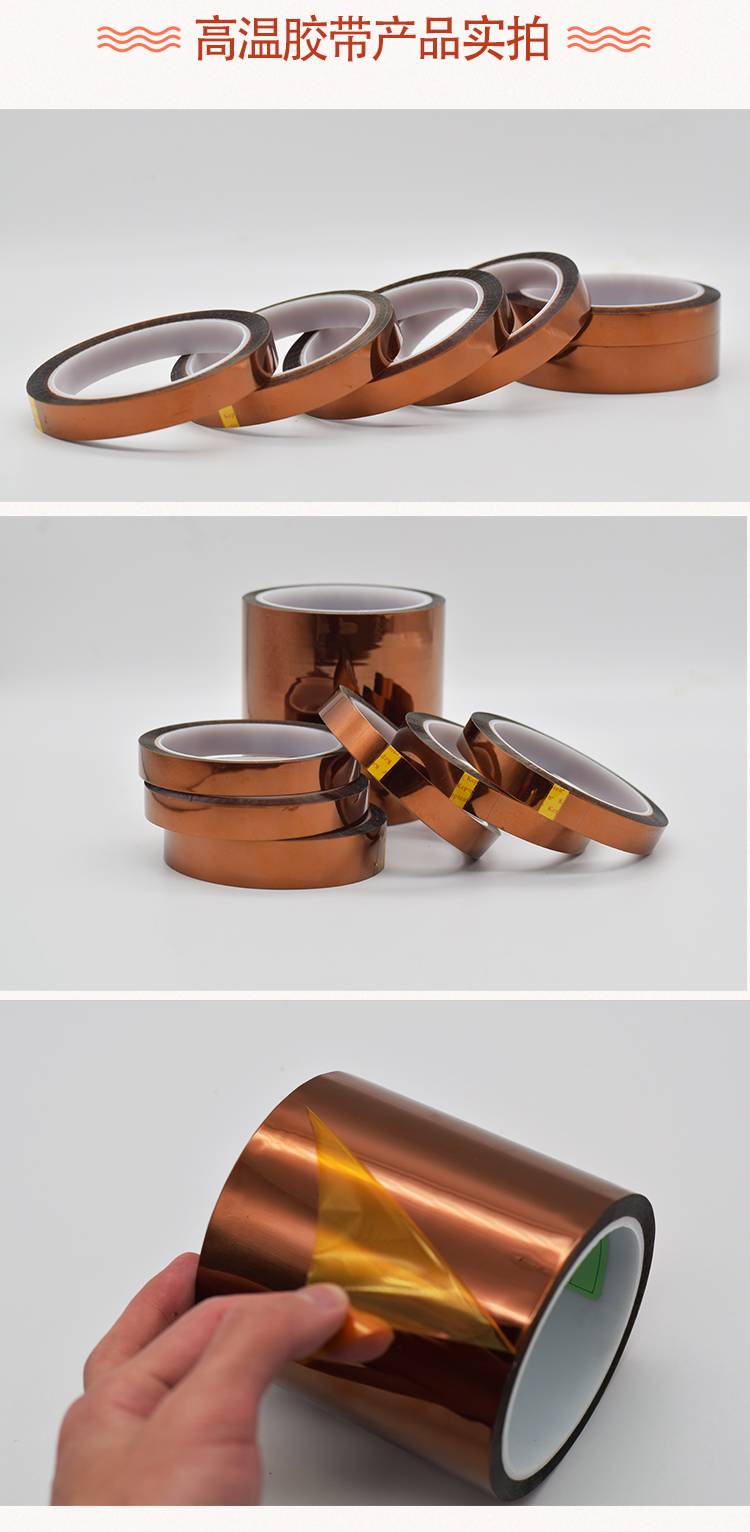 高溫膠帶,即高溫作業環境下使用的膠粘帶。主要用于電子工業用途,耐溫性能通常在120度到260度之間,常用于噴漆、烤漆皮革加工、涂裝遮蔽和電子零件制程中固定、印刷電路板及高溫處理遮蔽。高溫膠帶包括KAPTON高溫膠帶;鐵氟龍高溫膠帶;高溫美紋紙膠帶;PET綠色高溫膠帶;高溫雙面膠等。